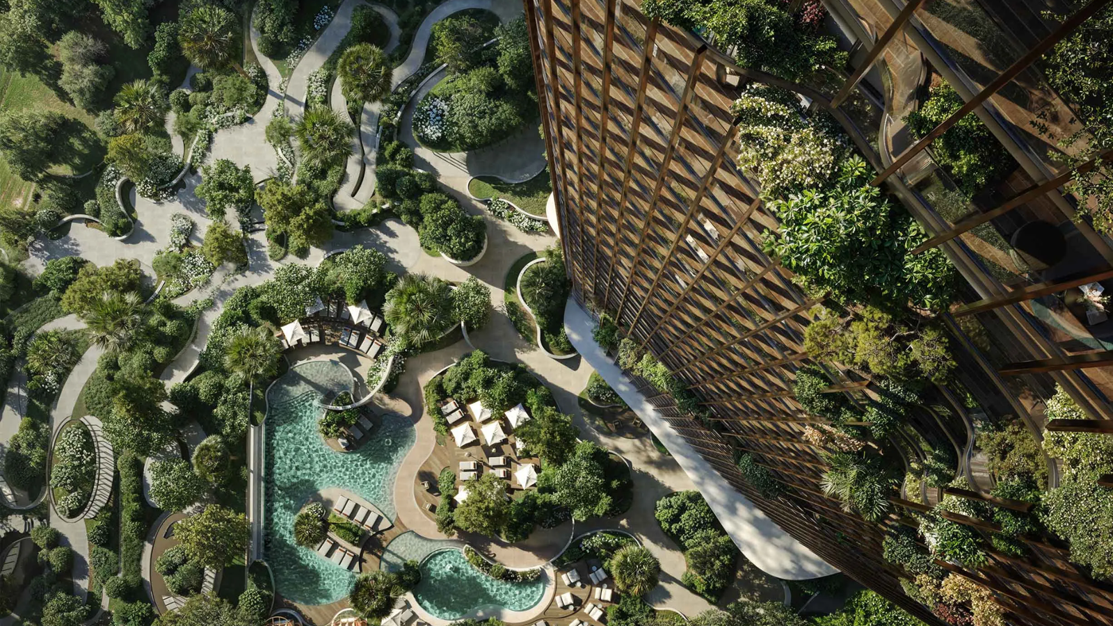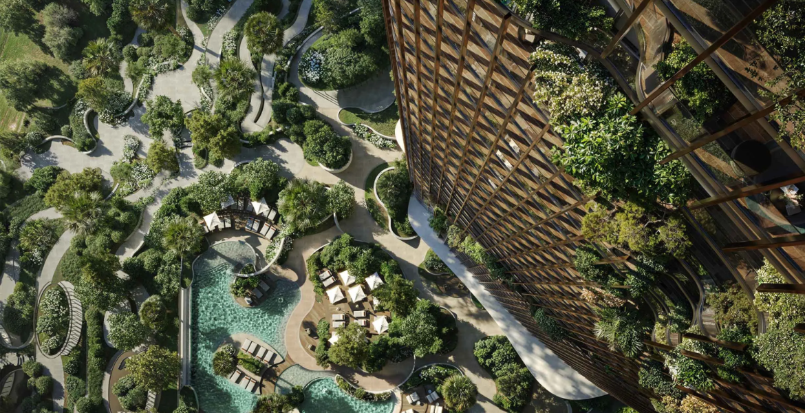 • Sculptural residential tower in the Forest District • 1–3 bedroom apartments and 2-bedroom units with maid’s room • Wraparound canyon-style balconies with waterfront views • Open-plan layouts with premium interior finishes • Wood-look flooring and stone countertops • Spa-inspired bathrooms • Swimming pools and rooftop haven • Fully equipped gym and wellness facilities • Kids’ club and private spa • Flexible 50/50 payment plan with Q2 2029 handover